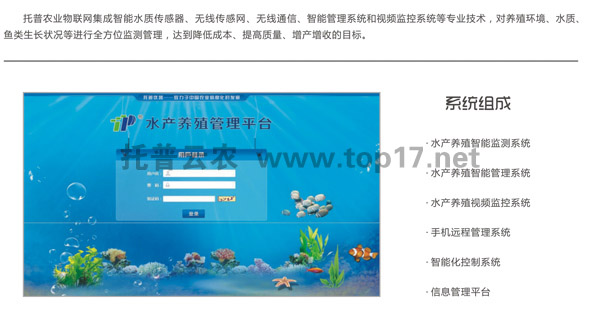 水產(chǎn)養(yǎng)殖監(jiān)控系統(tǒng)是一套物聯(lián)網(wǎng)為核心,貫穿整個養(yǎng)殖過程,科技化、智能化、便捷性、低成本、高收益的水產(chǎn)養(yǎng)殖系統(tǒng),它的應(yīng)用標(biāo)志著經(jīng)驗(yàn)養(yǎng)殖的方式正在逐漸成為歷史,科技養(yǎng)殖的時(shí)代開始到來。托普云農(nóng)水產(chǎn)養(yǎng)殖監(jiān)控系統(tǒng)利用各種水質(zhì)傳感器測驗(yàn)PH、溶解氧、溫度等重要的水質(zhì)數(shù)據(jù),并及時(shí)作出調(diào)整,使水質(zhì)達(dá)到最佳狀態(tài)。