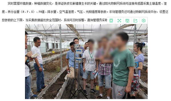 在《陽光物聯(lián)網(wǎng)引領(lǐng)仙草(鐵皮石斛)種植新方式》一文中,不僅“學習”物聯(lián)網(wǎng)系統(tǒng)的建設(shè)原理,以及操作方式外,還引用當時參觀時拍攝的圖片。為了降低圖片的辨識度,還對圖片進行模糊處理。