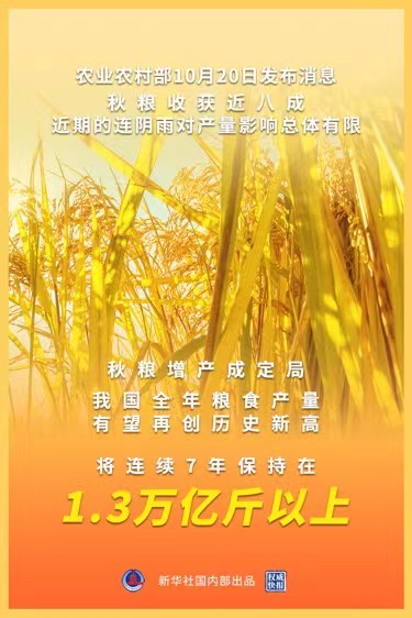 據(jù)農(nóng)業(yè)農(nóng)村部10月20日消息,目前秋糧收獲近八成,近期的連陰雨對產(chǎn)量影響總體有限,秋糧增產(chǎn)已成定局。全年糧食產(chǎn)量有望再創(chuàng)歷史新高,將連續(xù)7年保持在1.3萬億斤以上。(記者于文靜、胡璐,海報(bào)設(shè)計(jì)楊軼群)