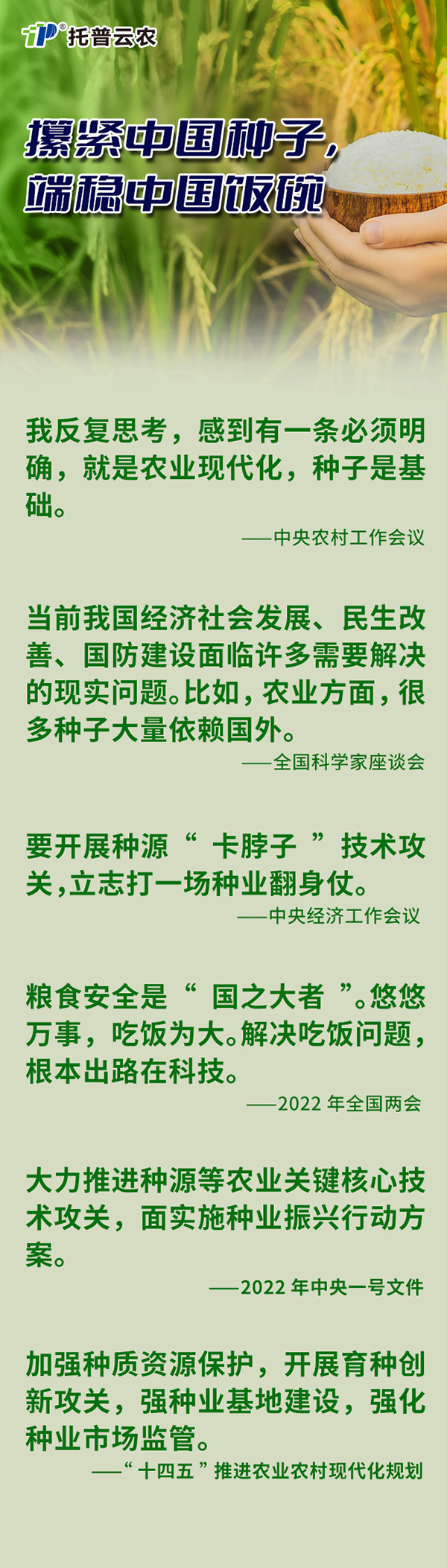 “種子是我國糧食安全的關(guān)鍵。只有用自己的手攥緊中國種子,才能端穩(wěn)中國飯碗,才能實現(xiàn)糧食安全!边@不是中央第一次提到種業(yè)發(fā)展問題,從中央農(nóng)村工作會議到“十四五”農(nóng)業(yè)農(nóng)村現(xiàn)代化發(fā)展規(guī)劃多次提出要把“種業(yè)發(fā)展”放到事關(guān)發(fā)展全局和國家安全的戰(zhàn)略大事上。
