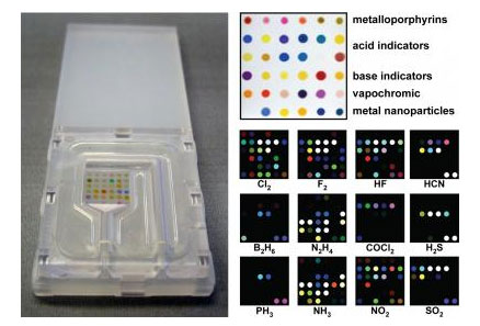 負(fù)責(zé)研制這種設(shè)備的Suslick教授表示:“我們開發(fā)的設(shè)備只不過是石蕊試紙的數(shù)字化多維碼擴(kuò)展版。我們采用了幾種不同的納米級多孔色素材料,并把這些材料排列成6x6的陣列。只要把陣列的顏色排列狀況與標(biāo)準(zhǔn)表進(jìn)行對比,就可以很快知道某環(huán)境中的化學(xué)品毒性程度。“