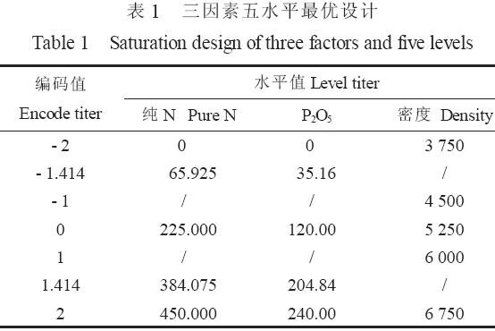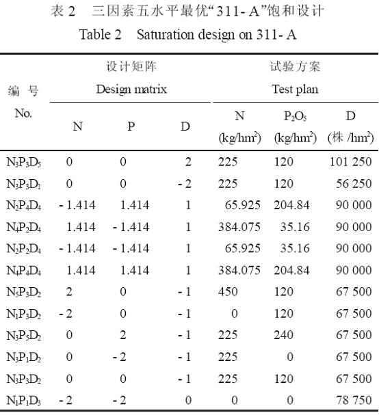 供試品種為青貯玉米品種金坤9 號(hào)。試驗(yàn)設(shè)計(jì)為施氮量(純N)、施磷量(P2O5)、種植密度(D)3 個(gè)因素、5 個(gè)水平, 采用311- A 飽和設(shè)計(jì), 12 個(gè)處理組合(表1, 表2), 重復(fù)3 次, 共36 個(gè)試驗(yàn)小區(qū), 每小區(qū)面積為15 m2, 行距50 cm。播種期為4 月28 日, 播種前施有機(jī)肥22 500 kg/hm2, 磷肥按處理水平作為底肥隨播種一次性施入, 尿素分別在小喇叭口期和大喇叭口期按施肥總量的30%和70%追施, 生育期間結(jié)合追肥灌水3 次, 其它管理措施同普通玉米大田。
