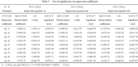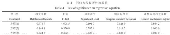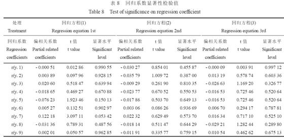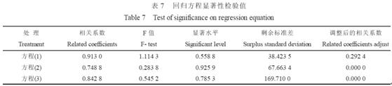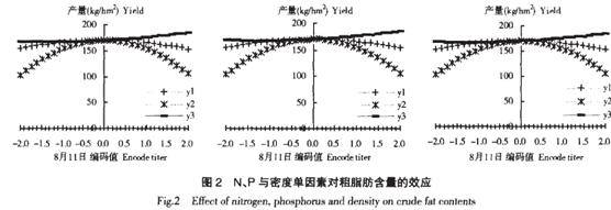 由一次項(xiàng)和二次項(xiàng)的偏回歸系數(shù)和t 值(表7、表8)可知, N、P、種植密度單因子與粗脂肪產(chǎn)量的關(guān)系, 在8 月11 日和9 月12 日收獲為密度(X3)>P(X2)>N(X1); 8 月26 日收獲為P(X2)>N(X1)> 密度(X3)。兩因子交互效應(yīng), 在8 月11 日和8 月26 日收獲為NP>N 密度>P 密度; 9 月12 日收獲為N 密度>NP>P 密度。
