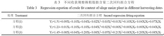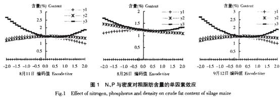 產(chǎn)量和品質(zhì)是青貯型玉米品種兩個(gè)不可缺少的評(píng)價(jià)因素。青貯玉米的品質(zhì), 國內(nèi)通常采用粗蛋白含量、粗脂肪含量、粗纖維含量、無氮浸出物和灰分含量等指標(biāo)判斷飼料的營養(yǎng)品質(zhì)。這種評(píng)價(jià)方法存在一定的缺欠。目前, 國際上通常根據(jù)營養(yǎng)成分、纖維素的類型和動(dòng)物離體實(shí)驗(yàn)等對(duì)青貯玉米品質(zhì)進(jìn)行劃分, 常用的指標(biāo)有粗蛋白含量、淀粉含量、中性和酸性洗滌纖維含量、木質(zhì)素含量、離體消化力和細(xì)胞壁消化力。其中粗蛋白含量可以通過蛋白質(zhì)測定儀測定,粗脂肪可以通過粗脂肪測定儀來測定,而粗纖維也可以通過纖維測定儀來測出。栽培措施是影響青貯玉米產(chǎn)量和品質(zhì)的重要因素。國內(nèi)外研究結(jié)果表明, 施肥對(duì)玉米子粒的營養(yǎng)品質(zhì)有顯著影響。在青貯玉米營養(yǎng)品質(zhì)對(duì)密度與肥料的反應(yīng)方面, 前人的研究尚不系統(tǒng), 其機(jī)理尚不清楚。本試驗(yàn)通過3 因素最優(yōu)飽和設(shè)計(jì), 研究N、P 與種植密度3 因素與不同收獲時(shí)期青貯玉米粗脂肪的關(guān)系, 并通過回歸模擬3 因子對(duì)青貯玉米粗脂肪含量及其產(chǎn)量的效應(yīng), 為實(shí)現(xiàn)青貯玉米高產(chǎn)優(yōu)質(zhì)栽培提供理論依據(jù)。
