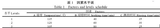 1. 4 正交設計提取方法 根據(jù)熱浸提—油重法測定原理,選定浸提溫度(A) 、浸提時間(B) 和淋洗時間(C) 作為考察因素,各設3 個水平,選用L9 (34 ) 正交表進行試驗(見表1) ,三次重復。