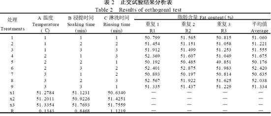 1. 6 數(shù)據(jù)分析 粗脂肪含量( %) = (W2 - W1 ) ×100/ W0 ,正交試驗結果的統(tǒng)計分析參考明道緒主編的有重復觀測值正交試驗結果,用新復極差法進行多重比較,在DPS 7. 05上完成。