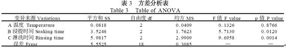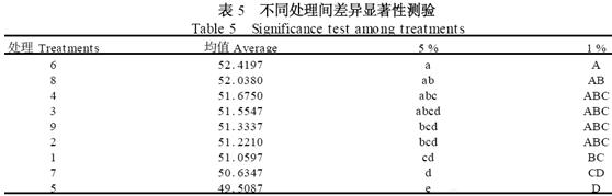 (0. 8468) > RA (0. 1343) ,即淋洗時間對測定結果影響最大,其次是浸提時間,浸提溫度的影響最小。方差分析結果表明(表3) ,因素B (浸提時間) 和因素C(淋洗時間) 各水平間差異顯著, 因素A(浸提溫度) 各水平間差異不顯著。由于因子A 不同水平間差異不顯著,結合B、C 因素各水平間的平均數(shù)和顯著性測驗結果(表4) ,B3C3 和B3C2 應為較好的提取方案。它們相對應于處理3 (A1B2 C3 )和處理6 (A2B3 C2 ) ,在9 個處理中分別位于第四位和第一位(表5) 。綜上所述,A2B3 C2 應為最優(yōu)組合,即浸提溫度120 ℃、浸提時間80 min、淋洗時間30 min 為花生粗脂肪的最佳提取方案。