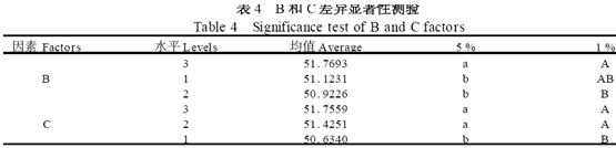 對粗脂肪含量數(shù)據(jù)進行直觀分析(表2) ,比較3個因素的極差( R) ,可見RC(1 . 1219) > RB