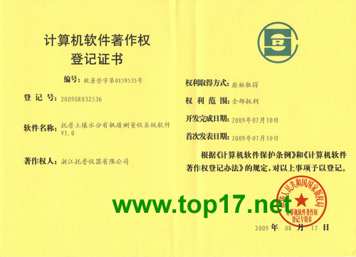 熱烈祝賀浙江托普土壤水分有機質測量儀器系統軟件獲軟件著作權證!