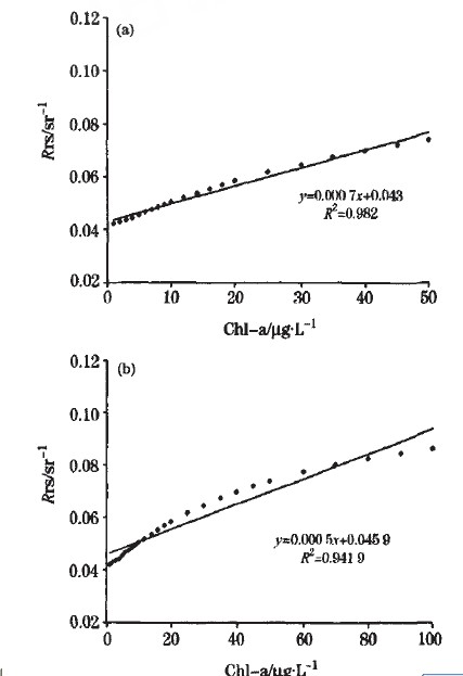 由圖2(a)可知,葉綠素在紅波段的反射峰強(qiáng)度同濃度有較好的線件相關(guān)性,其決定系數(shù)達(dá)0.982,利用葉綠素濃度同反射峰強(qiáng)度的相關(guān)關(guān)系,進(jìn)行葉綠素濃度的反演,有較好的反演效果,其RMSE為1.944 ug·L-1。但是當(dāng)葉綠素濃度達(dá)到10ug·L-1時(shí),這種線性相關(guān)關(guān)系逐漸減弱[圖2(b)],當(dāng)葉綠素濃度達(dá)到l 000ug·L-1時(shí),紅波段反射峰強(qiáng)度和葉綠素濃度則呈現(xiàn)較好的對(duì)數(shù)關(guān)系[圖2(c)],決定系數(shù)達(dá)0.965。