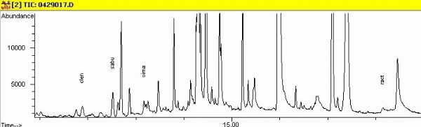 附圖:豬肝中0.5μg/L、1μg/L、2μg/L、5μg/L、10μg/L和100μg/L六個(gè)濃度檢測(cè)結(jié)果總離子流圖(TIC)代表圖譜: