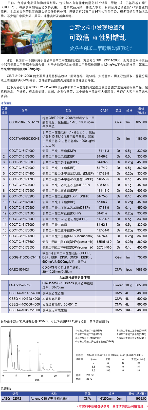 食品飲料中塑化劑的檢測方法及配套耗材