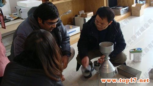 圖為:外國(guó)客戶親自動(dòng)手演示鐘鼎式分樣器,并不時(shí)提問(wèn)