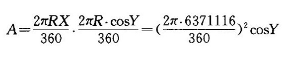 式中:R為地球半徑,x為經度/m,y 為緯度/m。則在地球表面Y經度處,經度差、緯度差各為一度的方格面積為: