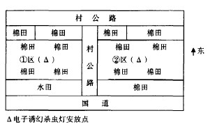 在鄒城街龍橋村選擇地勢平坦、水源方便、土壤肥力好、交通便利的連片棉田二處,面積共13.33hm²,每處6. 67hm²,將16瓦燈管各12瓦燈管的兩盞電源誘幻殺蟲燈分別懸吊放于這兩處棉田內,吊裝16瓦燈的6. 67hm²棉田簡稱1區(qū),吊裝12瓦的燈的6. 67hm²棉田簡稱2區(qū),每盞幻燈離地1.5m,燈距50m,開展誘殺害蟲實驗,詳見幻燈安裝及實驗分區(qū)位置圖。