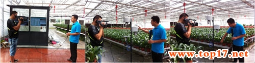 記者:所謂物聯網,其實簡單的說就是物物相連,互相感知。大家看我身后的一組探頭(托普儀器固定式無線農業氣象綜合監測站),包括這個是測量溫度的,這個是測量土壤墑情的,上面還有測量二氧化碳濃度的,測量光照強度的。那這些測量數據都會上傳到我身后的中央控制室內的計算機里,通過計算機的計算,再控制風扇、噴灌…這些設備的運轉。
