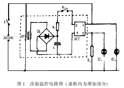 圖中K1、燈1、燈2、R2分別為原恒溫箱的電源開關(guān)、加熱指示燈、電源指示燈、發(fā)熱元件; K2為原恒溫箱溫控裝置的觸點; BJ為9V/220V、10W的變壓器; ZL為015A/50V的整流元件; C為220L/50V的濾波電容; R1為1008、1/8W的限流電阻; RCT為20A/220V的固態(tài)繼電器。BT、ZL、C產(chǎn)生約13VDC的控制信號源,經(jīng)R1、K2加到RCT的控制端3、4腳上,當(dāng)恒溫箱內(nèi)溫度低于設(shè)置溫度時, K2接通, RCT得到超過3VCD的控制信號, RCT的1、2腳導(dǎo)通,恒溫培養(yǎng)箱加熱升溫;當(dāng)達(dá)到設(shè)置溫度后, K2斷開, RCT的3、4腳間電壓為0V, RCT的1、2腳截止,培養(yǎng)箱停止加熱,這樣原有溫控既達(dá)到了控溫的目的,又避免了觸點打火的缺點。