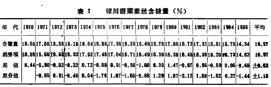 菜絲含糖量的年際變化從銀川糖廠1970~1985年菜絲含糖量的資料看,有兩個特點:是利用正交多項式,計算含糖量的趨勢變化(見表1)有個連續(xù)下降的趨勢。含搪量1970~1976年在17%以上,1977~1953年下降到16%,1954年下降到16%以下,1985年下降到15%以下。從1978年的18.50%到1985年的14.34%,含塘量前后共下降了4.16%。這種下降趨勢,主要反映了甜菜品種的退化和生產(chǎn)管理水平的降低,如大量施用氮肥,以及甜菜面積的不斷擴大。二是年際間還出現(xiàn)了高低變化。這種變化很大程度上是因為氣象條件的變化所引起的,因此稱這個變量為氣候含糟里,從表1可見,除1978年外,般表現(xiàn)為高低約兩年周期。