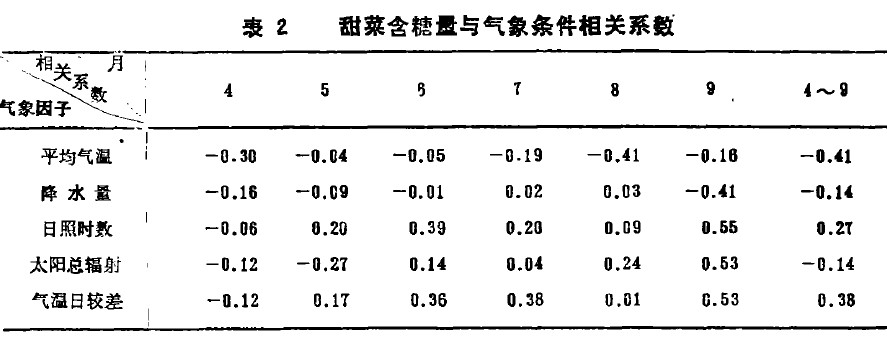 氣候含糖量與4~9月氣溫日較差呈正相關(guān)(見表2),相關(guān)系數(shù)r=38,5,月各月均為正相關(guān),7月達。8~9月達53,具有與日照相關(guān)相同的趨勢,因此氣溫百較差也是影響甜菜搪分積累的主要氣象因子之。