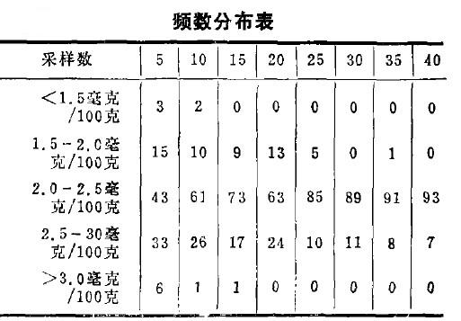 因?yàn)槠骄?.345毫克/百克土,可以認(rèn)為在2.0一2.5毫克/百克土間近似平均值范圍,在此范圍內(nèi)出現(xiàn)頻數(shù)越多,其采樣伐表性越好。假設(shè),每次只采五點(diǎn)混合樣品進(jìn)行分析,在一百次中,僅有43次可能接近平均值,有9次機(jī)會(huì)不是高于3.0毫克/百克土,或者低于1.5毫克/百克土。