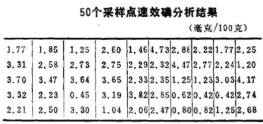 在調(diào)查的耕地上,以等距離方格法,單點(diǎn)采集土壤樣品50個(gè),單獨(dú)以相蘭法分析其速效磷,五十點(diǎn)樣品速效磷分析結(jié)果如表2,表2中次序是采樣點(diǎn)的實(shí)際位置。50點(diǎn)速效磷分析結(jié)果的均值僅2.349毫克/百克土,極差(R)4.51,方差(52)1.1,不均勻率(CV)0.348。