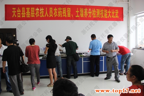2013年6月7日,在天臺縣農(nóng)業(yè)局新農(nóng)技大樓里舉行了一場別開生面的比賽:農(nóng)藥殘留、土壤養(yǎng)分檢測技能大比武。徐志恒參加會議,天臺縣農(nóng)業(yè)局科長參賽人員為來自天臺縣各個鄉(xiāng)鎮(zhèn)的基層農(nóng)技工作人員以及天臺縣部分農(nóng)業(yè)企業(yè)的農(nóng)殘檢測員共計三十人。托普儀器作為儀器提供商,派技術(shù)人員對現(xiàn)場戰(zhàn)況做出了評定。