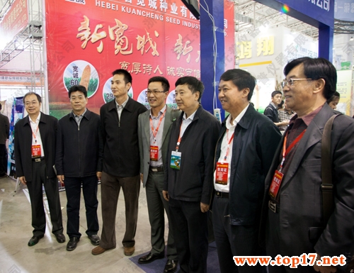 圖為:托普總經(jīng)理陳渝陽(yáng)先生引領(lǐng)農(nóng)業(yè)部種子管理局張延秋局長(zhǎng)(右二),吉林農(nóng)委李國(guó)強(qiáng)主任,全國(guó)農(nóng)技推廣服務(wù)中心黨委杭大鵬(右四)書(shū)記等領(lǐng)導(dǎo)參觀公司展臺(tái)