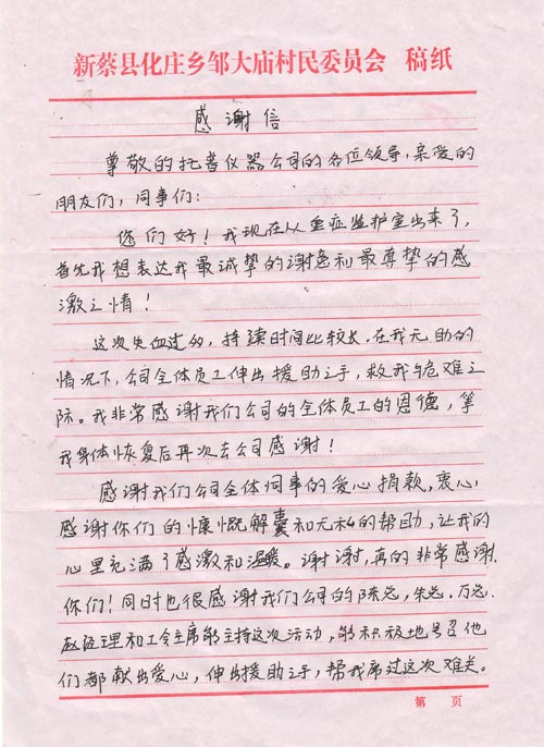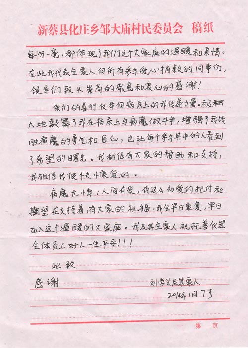 1月15日,公司收到劉學(xué)義寫來的信,信中他告訴托普家人他的病情已好轉(zhuǎn),術(shù)后已由重癥監(jiān)護(hù)室轉(zhuǎn)入普通病房,等待觀察與休養(yǎng)。長長的一封信,給同事們帶來了喜悅的消息,也傾訴著他對托普家人的深深謝意!