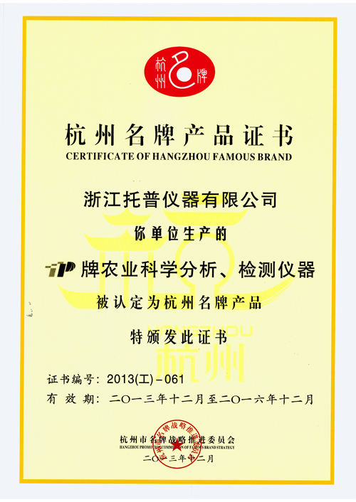 2013年11月26日根據(jù)杭州市名牌戰(zhàn)略推進委員會組織綜合評價,共選出115個產(chǎn)品,其中農(nóng)業(yè)產(chǎn)品30個,工業(yè)產(chǎn)品62個,服務(wù)業(yè)產(chǎn)品23個。經(jīng)過托普人不懈的努力,托普儀器申報的農(nóng)業(yè)科學(xué)分析、檢測儀器最終被列為2013年杭州工業(yè)產(chǎn)品類的名牌產(chǎn)品。