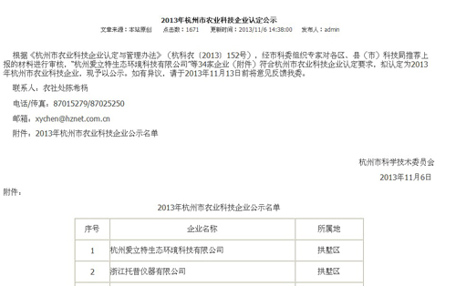 根據(jù)《杭州市農(nóng)業(yè)科技企業(yè)認定與管理辦法》(杭科農(nóng)〔2013〕152號),經(jīng)市科委組織專家對各區(qū)、縣(市)科技局推薦上報的材料進行審核,“浙江托普儀器有限公司”等34家企業(yè)(附件)符合杭州市農(nóng)業(yè)科技企業(yè)認定要求,擬認定為2013年杭州市農(nóng)業(yè)科技企業(yè)。