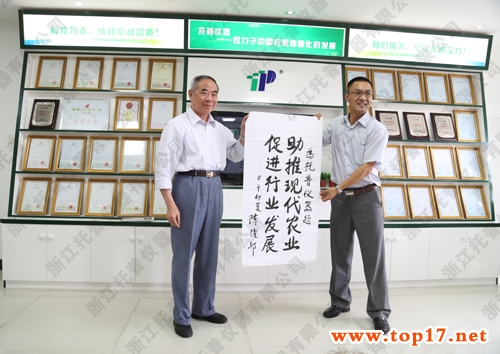 圖為:陳部長為托普儀器題下十二字勉勵之語:助推現(xiàn)代農(nóng)業(yè),促進行業(yè)發(fā)展