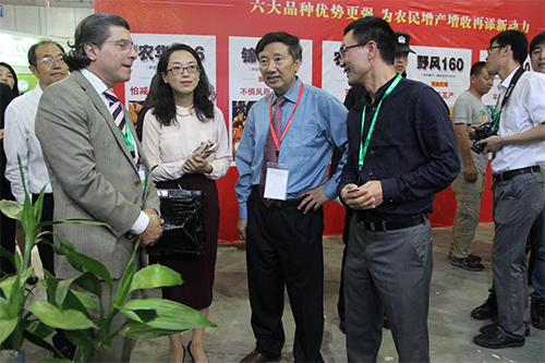種子雙交會期間,農(nóng)業(yè)部種子管理局局長張延秋、副局長馬淑萍一行還帶領(lǐng)前來參加中國-阿根廷種業(yè)交流峰會的阿根廷代表團參觀了托普云農(nóng)展區(qū)。阿根廷國家種子研究所董事會主席拉威諾勒 萊英姆多農(nóng)業(yè)工程師仔細觀摩了公司所展出的種子檢驗儀器和系統(tǒng),并與陳渝陽總經(jīng)理進行交流。
