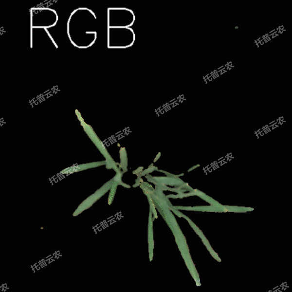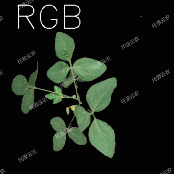 可見光二維成像單元:獲取植株側(cè)視可見光圖像,并利用人工智能算法分析獲取株高、葉頂點數(shù)、投影面積等形態(tài)參數(shù),黃色投影面積、綠色投影面積等顏色參數(shù),以及平滑度等紋理參數(shù),用于植株株型與健康狀態(tài)相關(guān)表型分析。