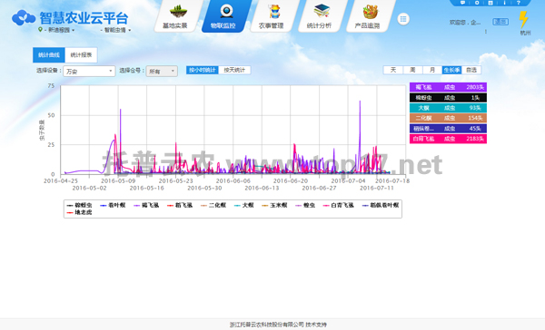 該智能病蟲害監測系統可自動完成蟲情信息、病菌孢子、農林氣象信息的圖像及數據采集,并自動上傳至云服務器;遠程無線傳輸、實時顯示、存儲蟲情、病菌孢子圖像;通過圖像信息庫及技術分析功能,分析田間的病蟲害數量變化,預測病蟲害的發生時間和趨勢;用戶可通過云平臺或手機APP實時查看數據,遠程管理設備,實現信息化管理,達到省、市、縣、鄉各級信息采集站無線傳輸,運程控制,信息數據共享,從而提高相關部門的病蟲害監測防控能力。